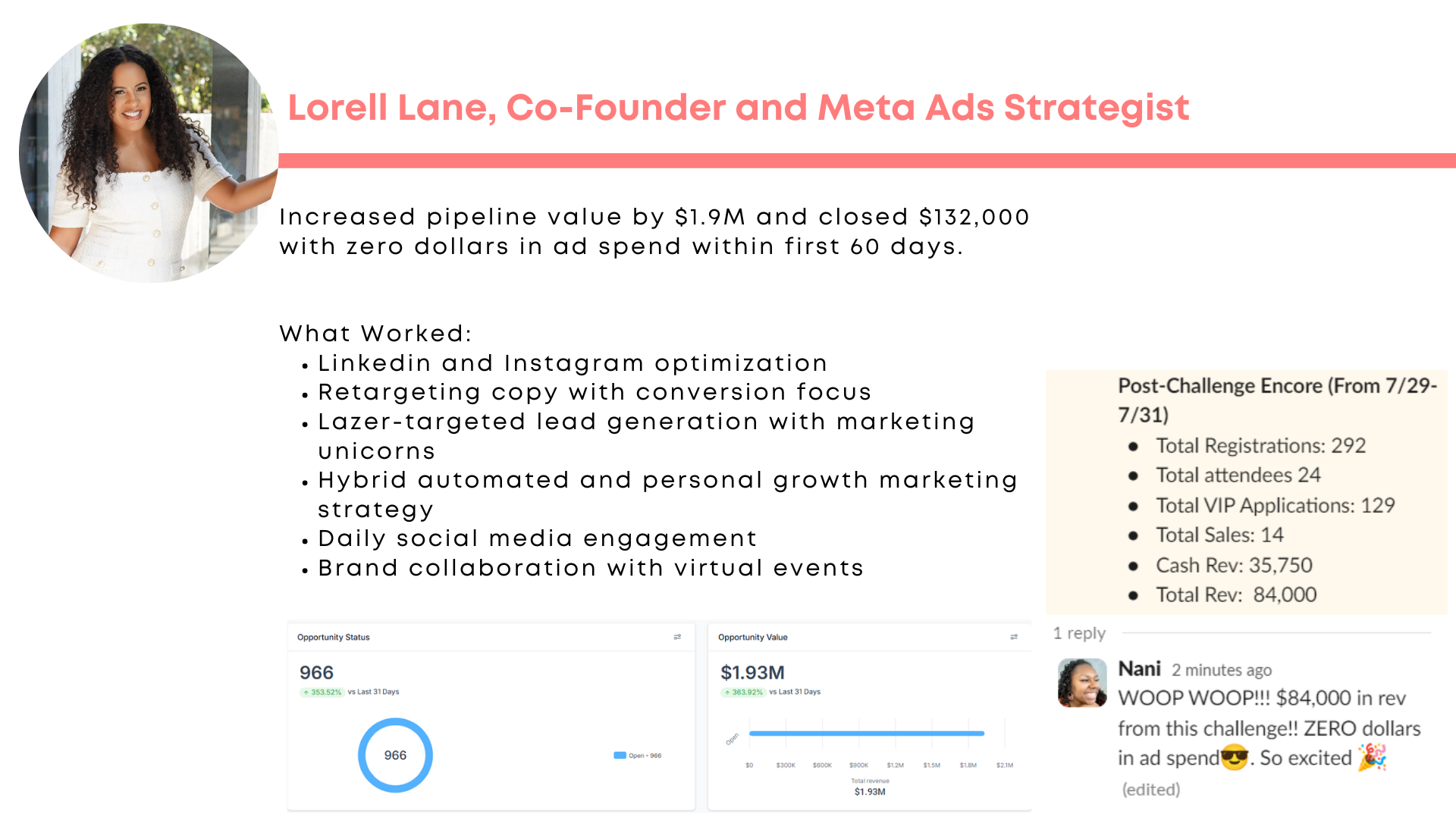 Our mission: Slaying more sales goals with less overwhelm. Operating with the efficiency of a Fortune 500 company while enjoying the simplicity of a boutique business. Helping founders scale to five and six-figure revenue months while scaling back to 3 day work weeks. Helping corporations market smart by reaching more people and revenue with less ad spend.